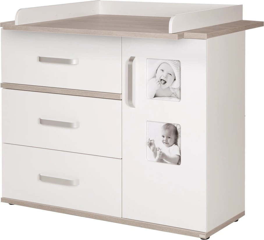 Přebalovací pult Moritz od značky Roba vynikne díky dvěma rámečkům na fotografie zabudovaným ve dvířkách komody.