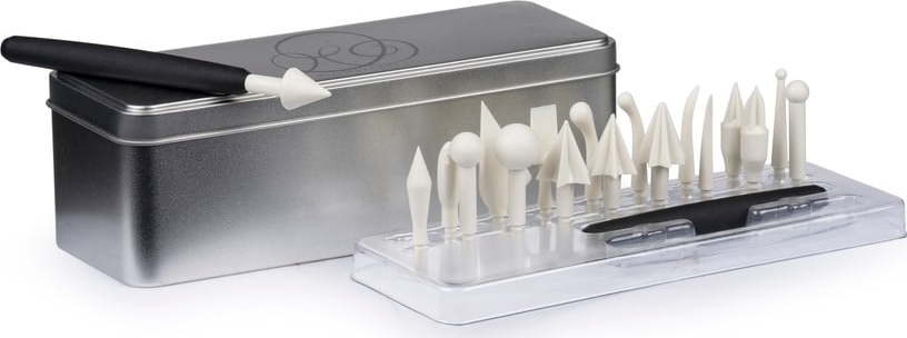Vzhledem k osmnácti různým nástavcům umožní tato cukrářská sada od značky Blomsterbergs snadné, precizní a zároveň detailní modelování marcipánových či fondánových dekorací. Společně se dvěma dvojitými rukojeťmi jsou při nepoužívání skladovány v kovové krabičce.