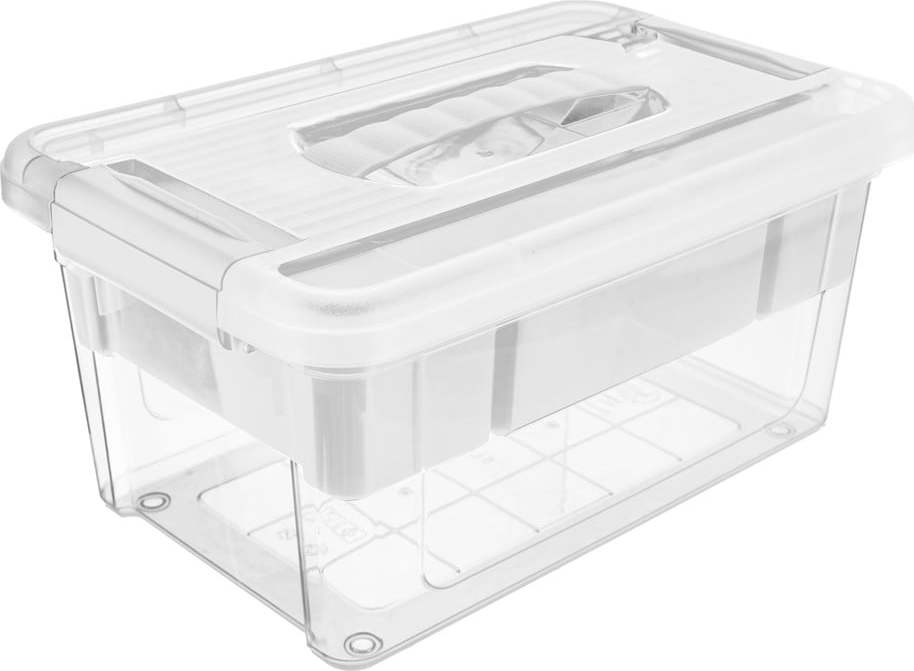 Vzhledem k transparentnímu provedení a praktické vyjímatelné vložce se čtyřmi různými přihrádkami je tento úložný box ideální pro skladování i drobných nezbytností, přičemž nad uloženým obsahem budete mít neustále dokonalý přehled. Disponuje víkem s postranními klipy a madlem, který usnadňuje jeho případné přenášení.